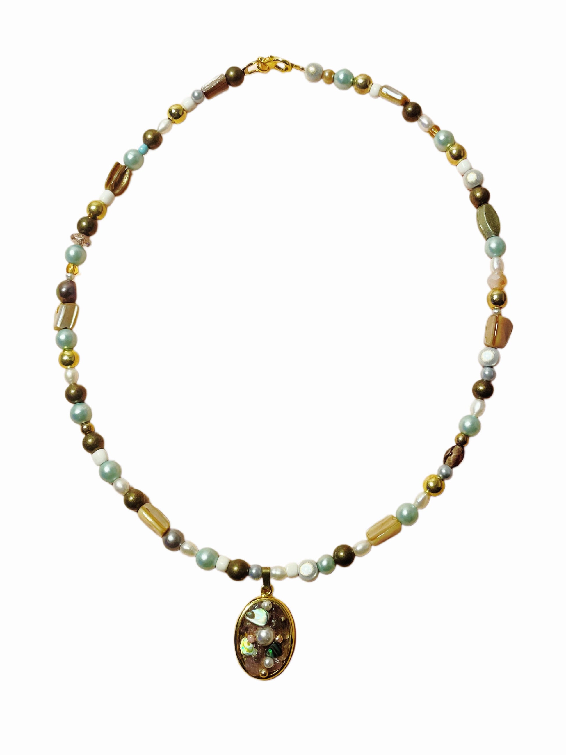 This necklace has been crafted entirely from sustainably sourced, secondhand materials, handpicked by me to create a truly one-of-a-kind piece.